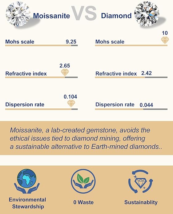 Brilliant Moissanite Sparkle: Each moissanite stone is precisely cut to reflect light like natural diamonds, offering fire, brilliance, and clarity at a fraction of the cost.
